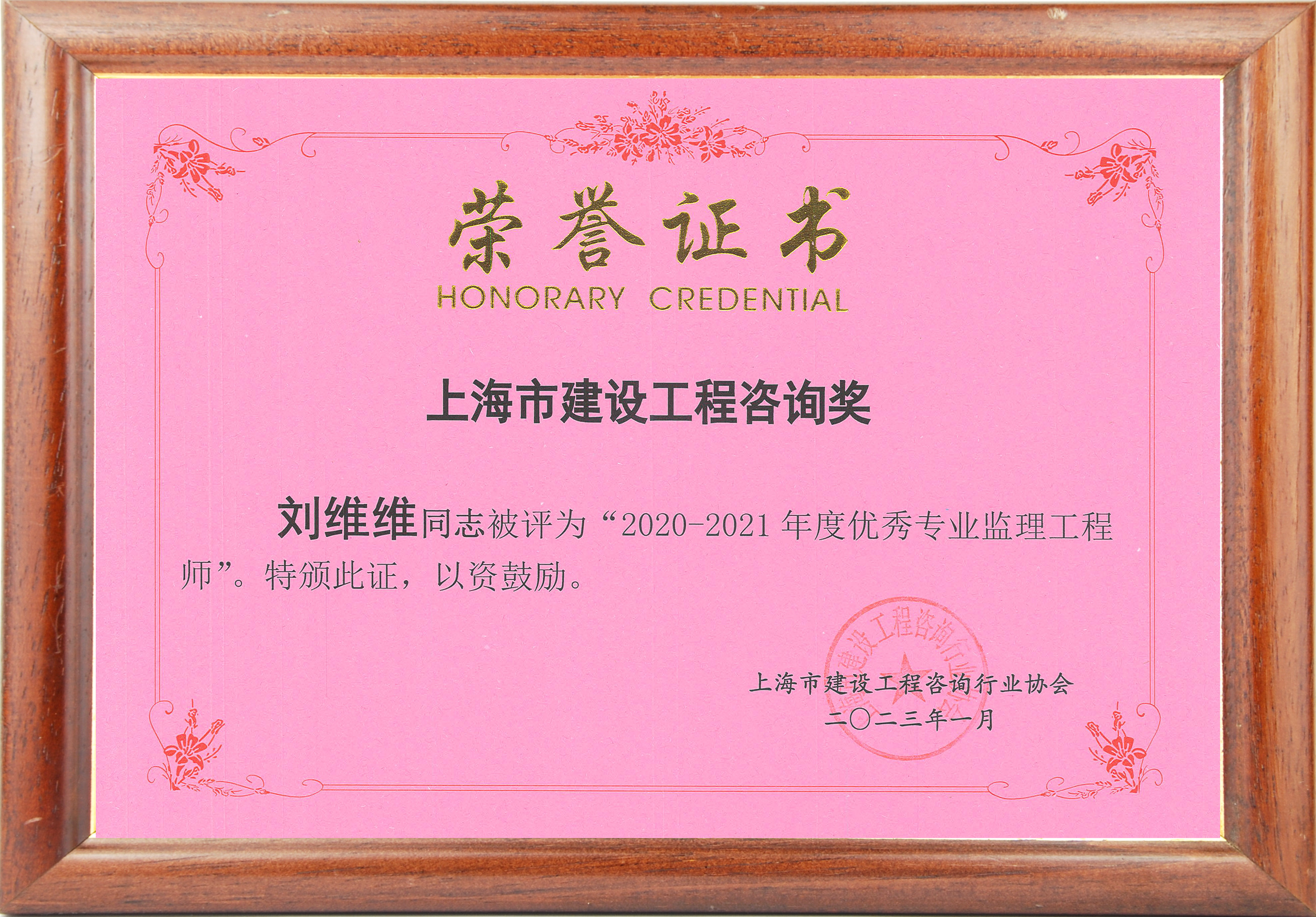 2020-2021年度上海市优秀专业监理工程师(刘维维)