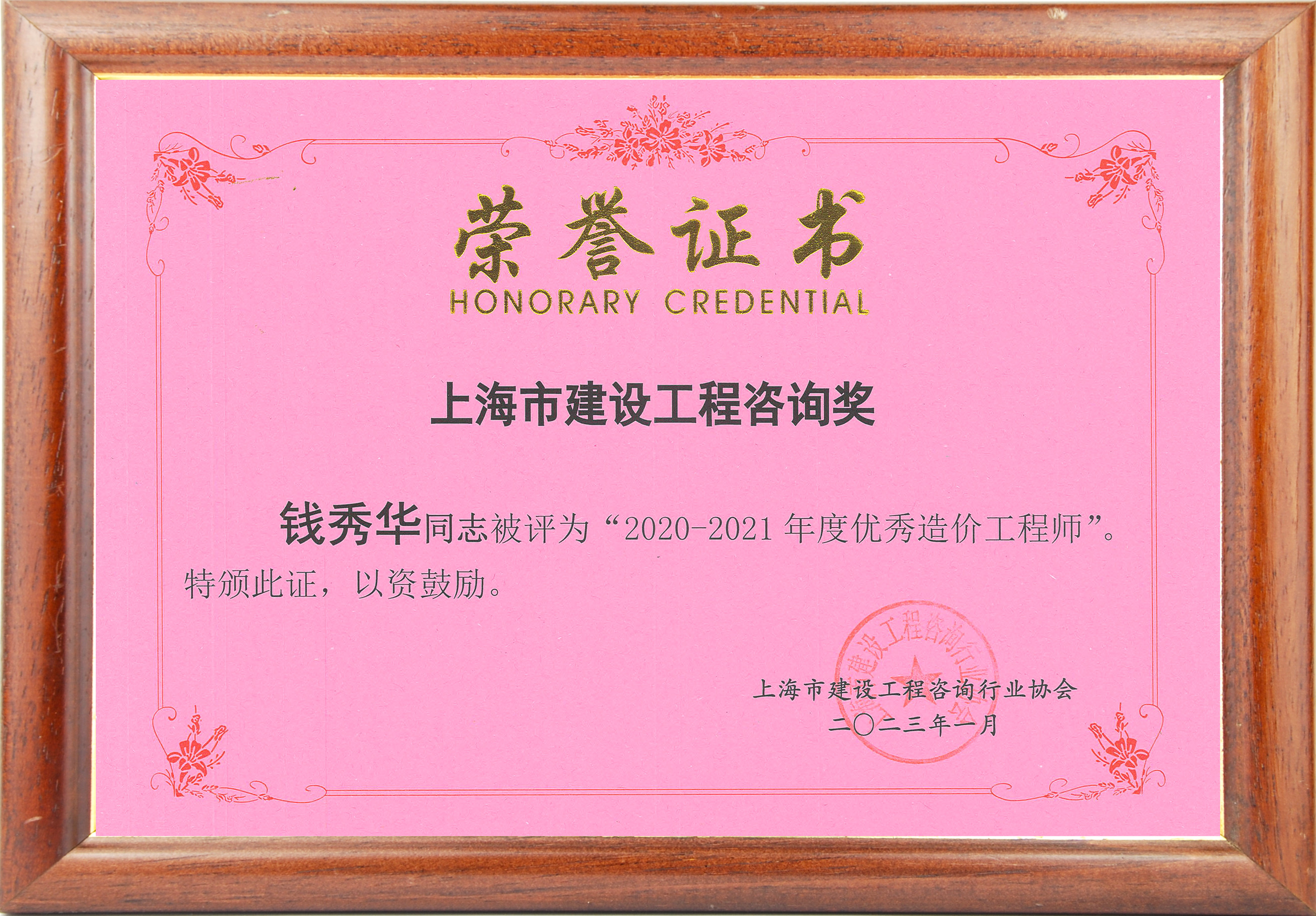 2020-2021年度上海市优秀造价工程师(钱秀华)