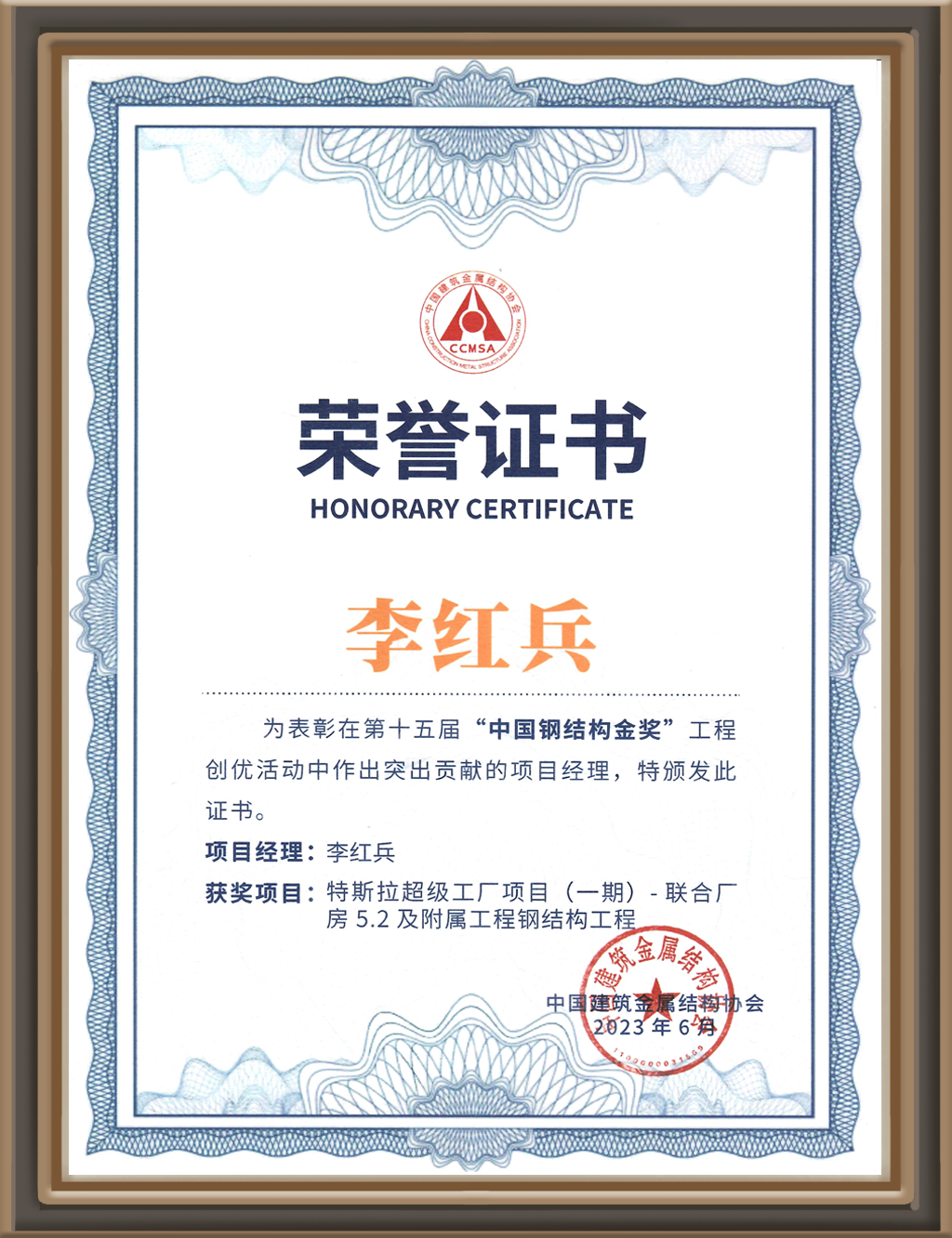 第十五届“中国钢结构金奖”工程创优活动中作出突出贡献项目经理...