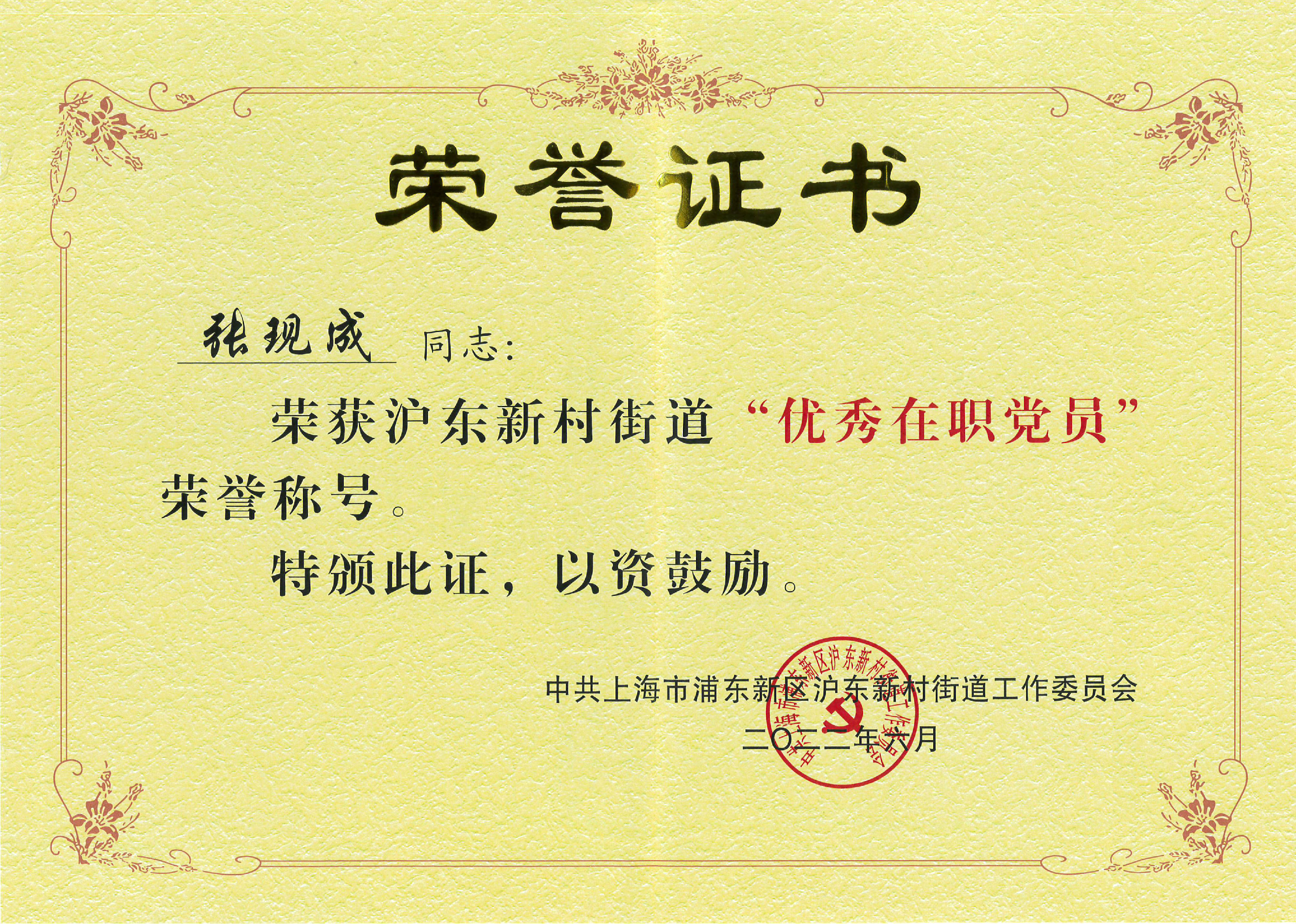 2022年“优秀在职党员”荣誉称号(张现成)
